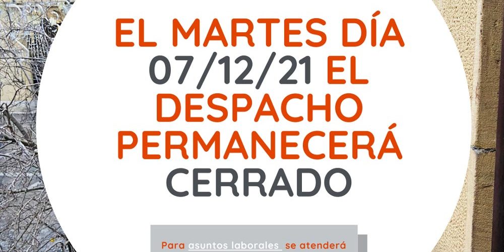 Dic32021Sin categoríaEl despacho de Addi Consulting estará cerrado el día 7 de diciembre de 2021. Category: Sin categoría3 diciembre, 2021Noticias RelacionadasOficina Cerrada 18/09/2417 septiembre, 2024Feliz Navidad y Próspero Año Nuevo22 diciembre, 2023Nueva obligación de comunicación10 octubre, 2023Nuevas medidas de conciliación28 septiembre, 2023Cierre por vacaciones del 14-18 agosto de 202311 agosto, 2023Horario verano10 julio, 2023