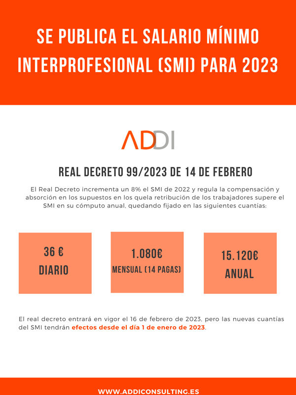 El Real Decreto 99/2023 de 14 de febrero incrementa el Salario Mínimo Interprofesional un 8% con respecto a 2022.